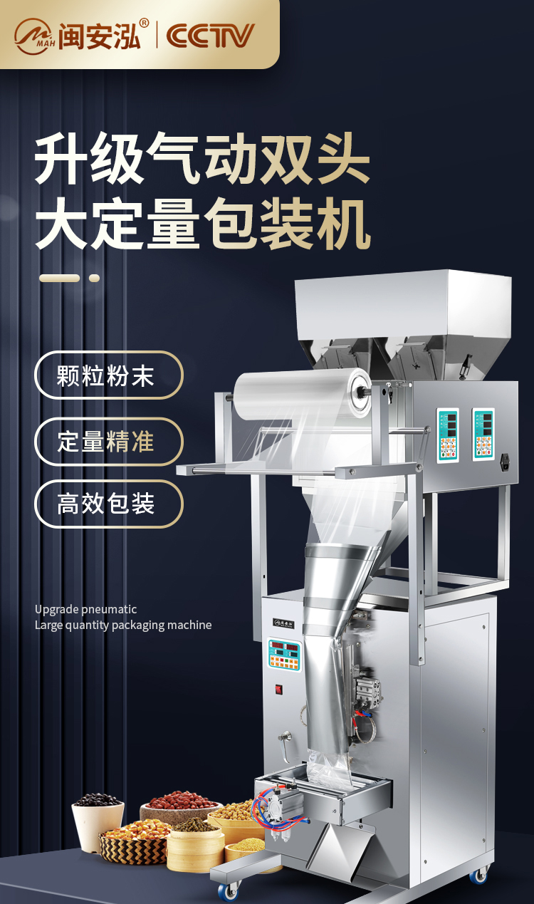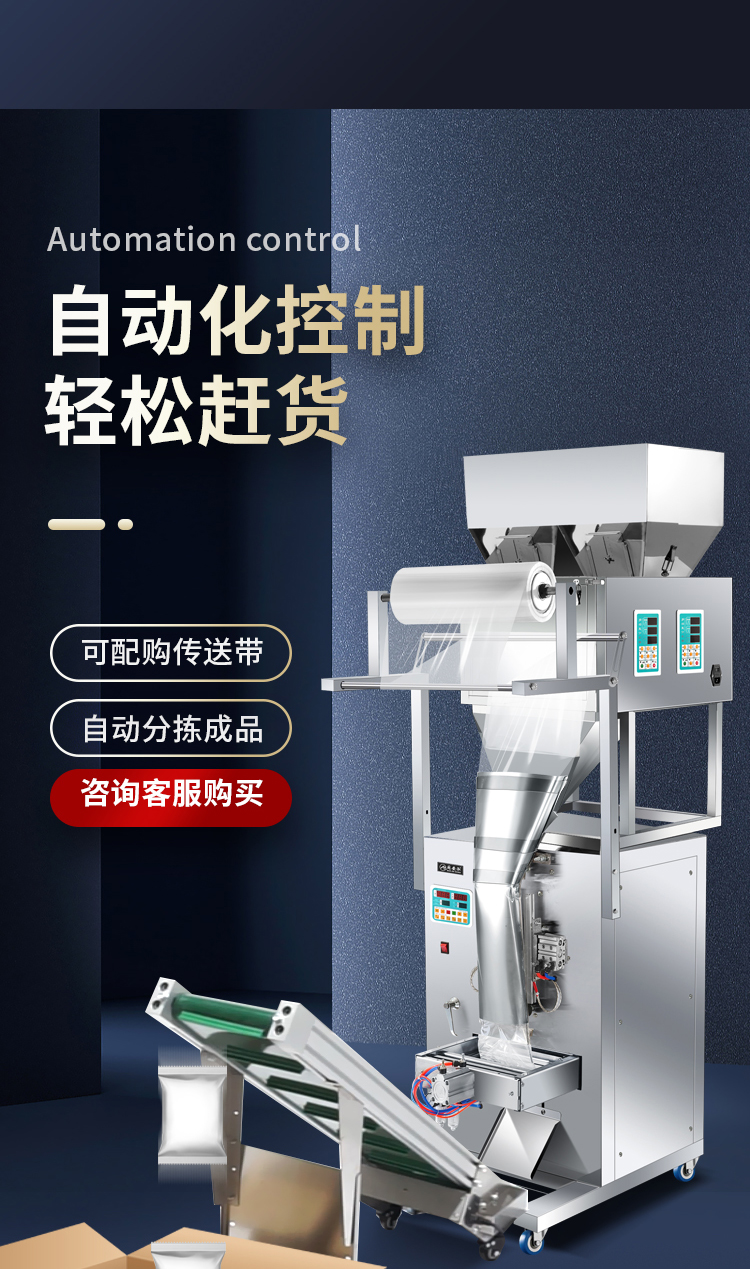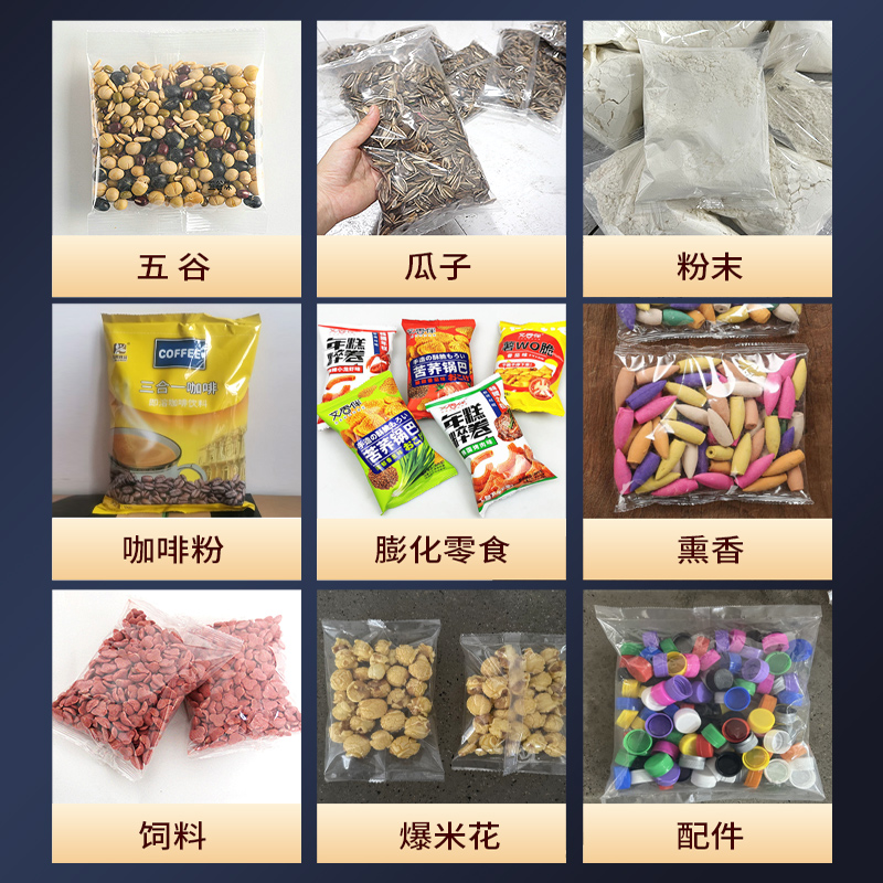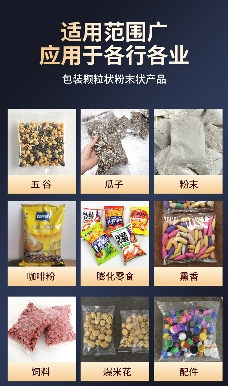 - 五谷杂粮、调味料、各种粉末、坚果、零食、药品、宠物饲料、种子化肥等各类颗粒粉末状产品
