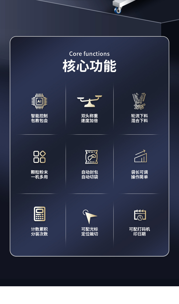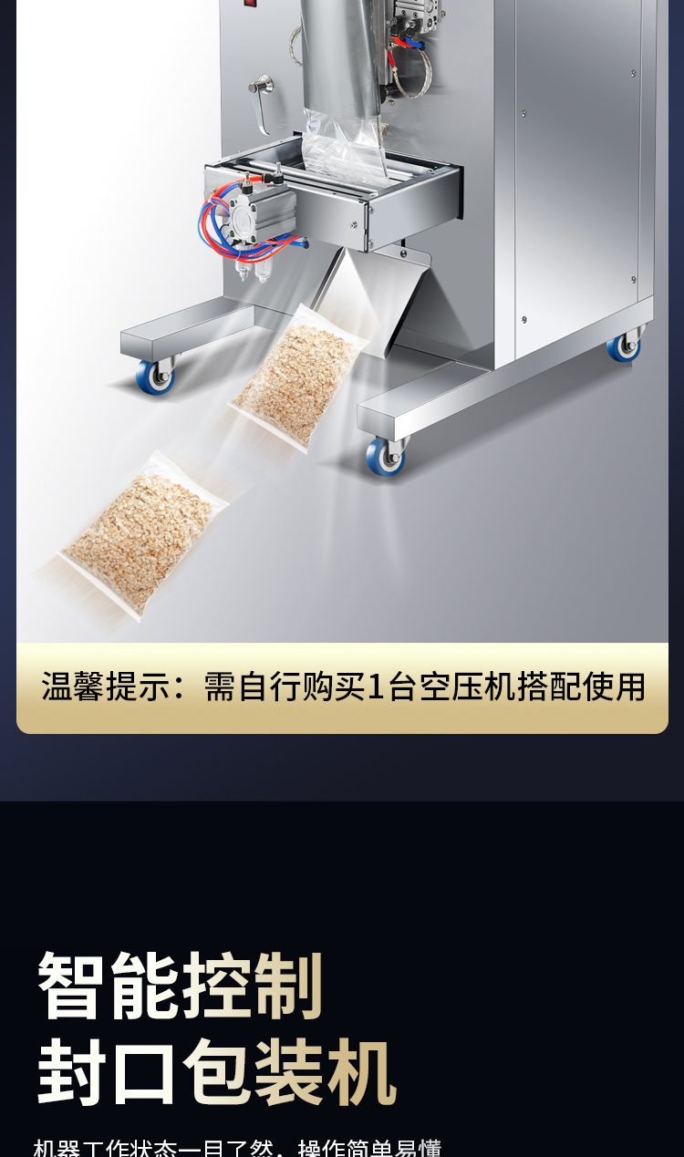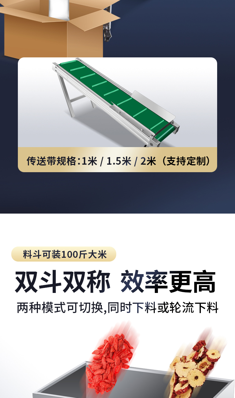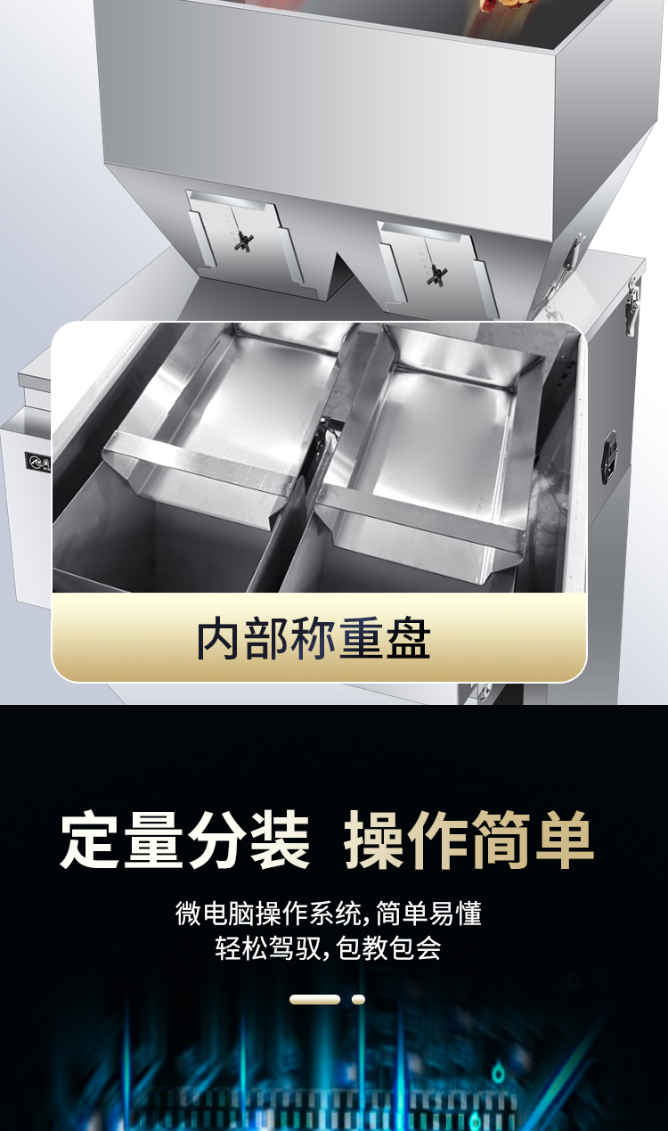 - 五谷杂粮、调味料、各种粉末、坚果、零食、药品、宠物饲料、种子化肥等各类颗粒粉末状产品