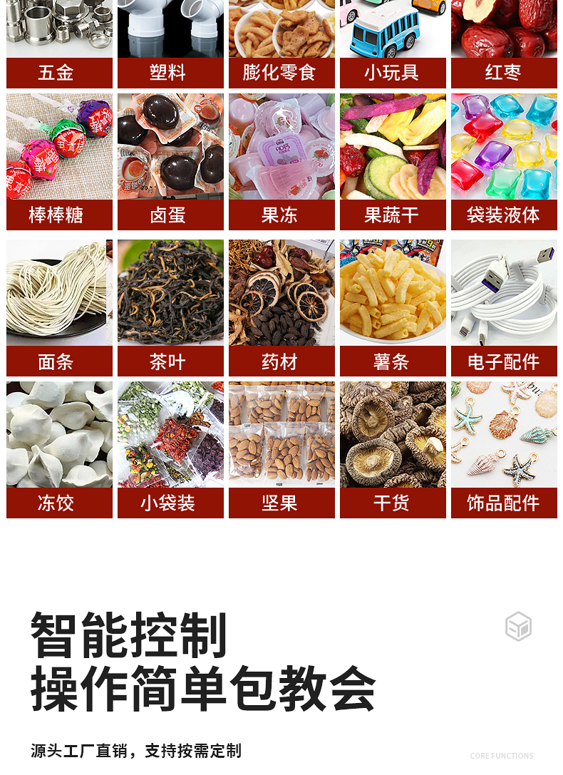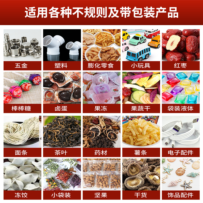 五金配件、积木、玩具、面条、果冻、零食、电子配件、塑料制品等各种不规程及带包装袋的产品