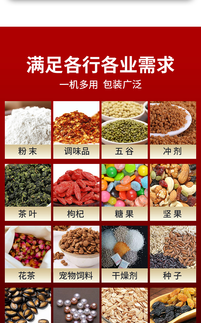 五谷杂粮、调味料、鸡精、味精、坚果、零食、饲料、化肥、种子、干燥剂、小米、黄豆、枸杞、药丸、等各类颗粒状产品