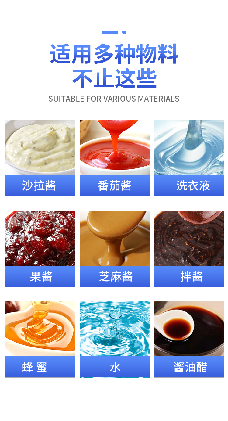 番茄酱、蜂蜜、沙拉酱、花生酱、洗衣液、沐浴液、酱油醋、等各种带流动性的液体膏体