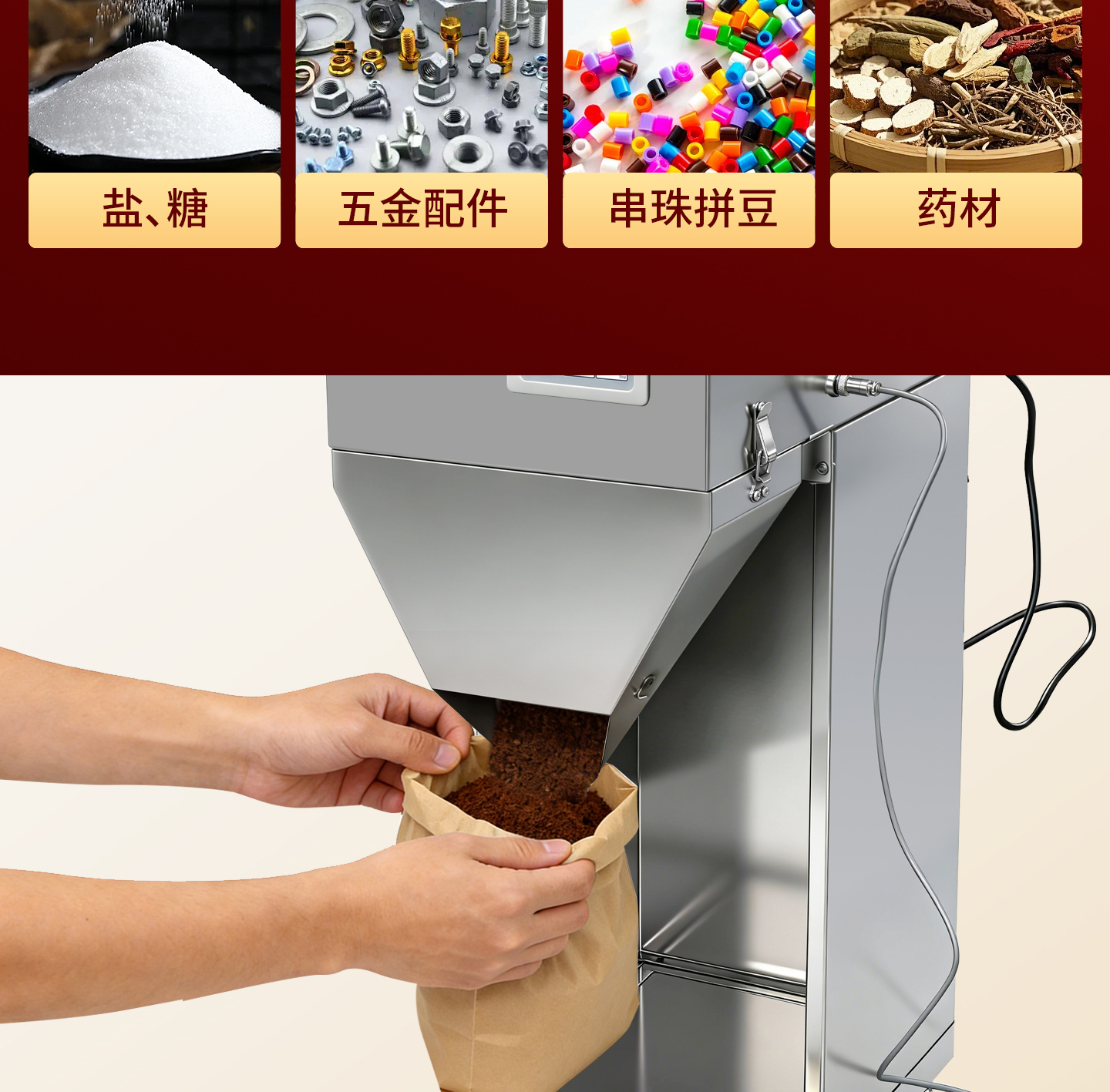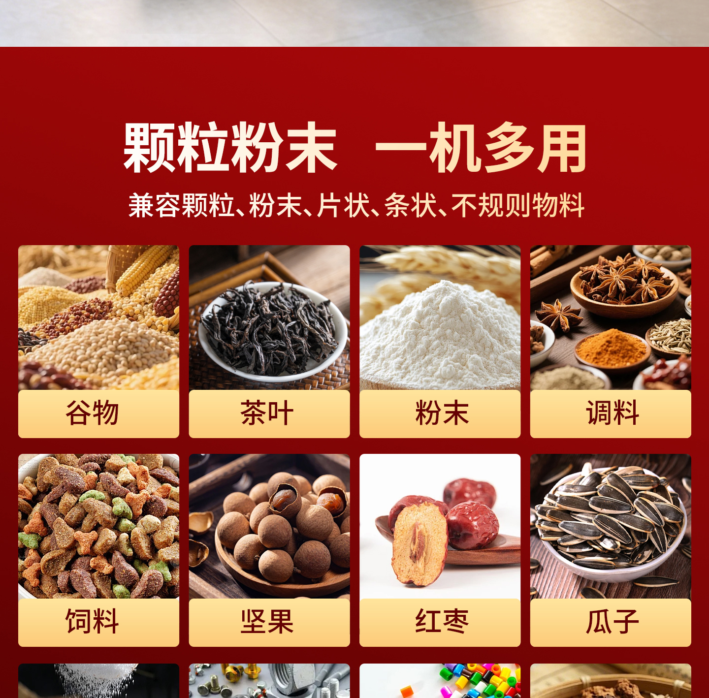 - 五谷、干货、茶叶、塑料、化肥、粉末、调料、药材、五金、饰品、零食、坚果等各类产品