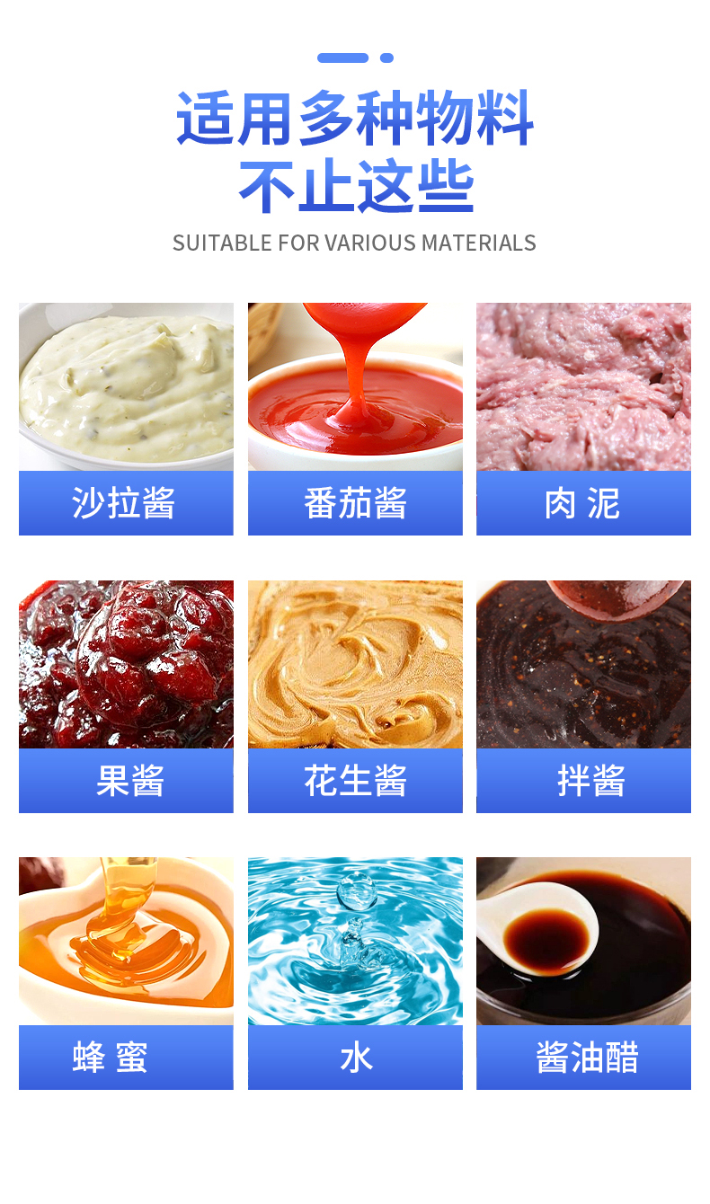 - 番茄酱、蜂蜜、沙拉酱、花生酱、洗衣液、沐浴液、酱油醋、等各种带流动性的液体膏体