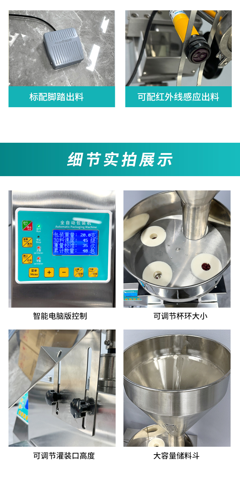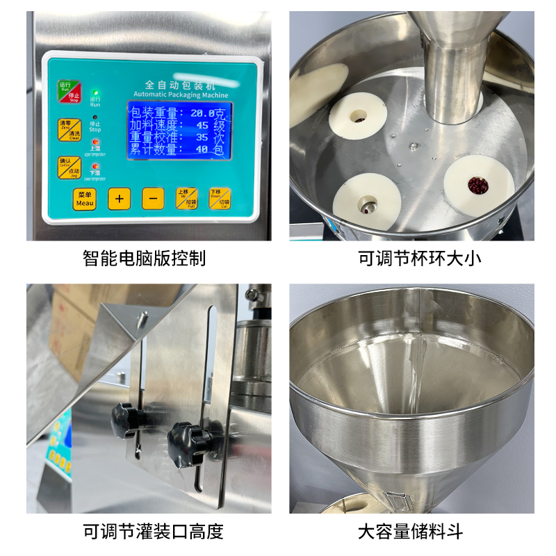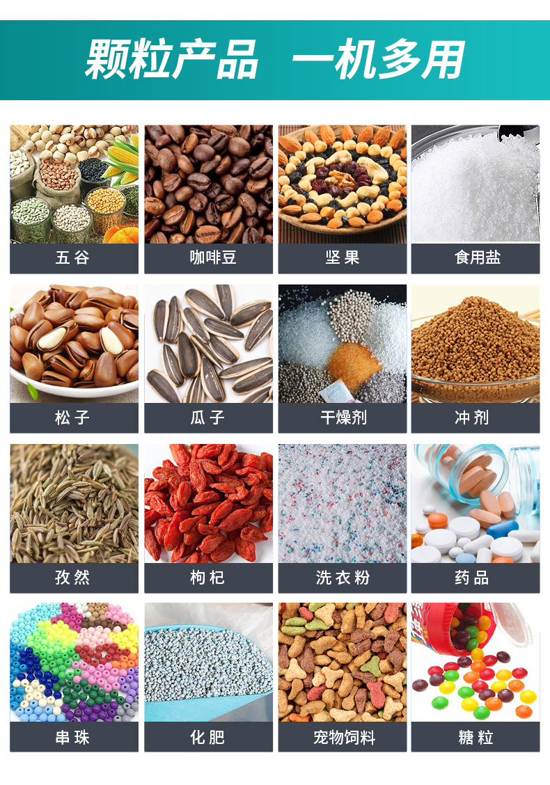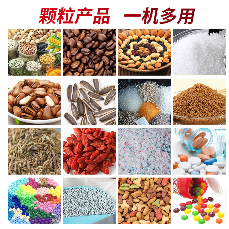 五谷杂粮、坚果、干燥剂、零食、瓜子、枸杞、糖果、饲料、化肥等各类小颗粒状产品适用