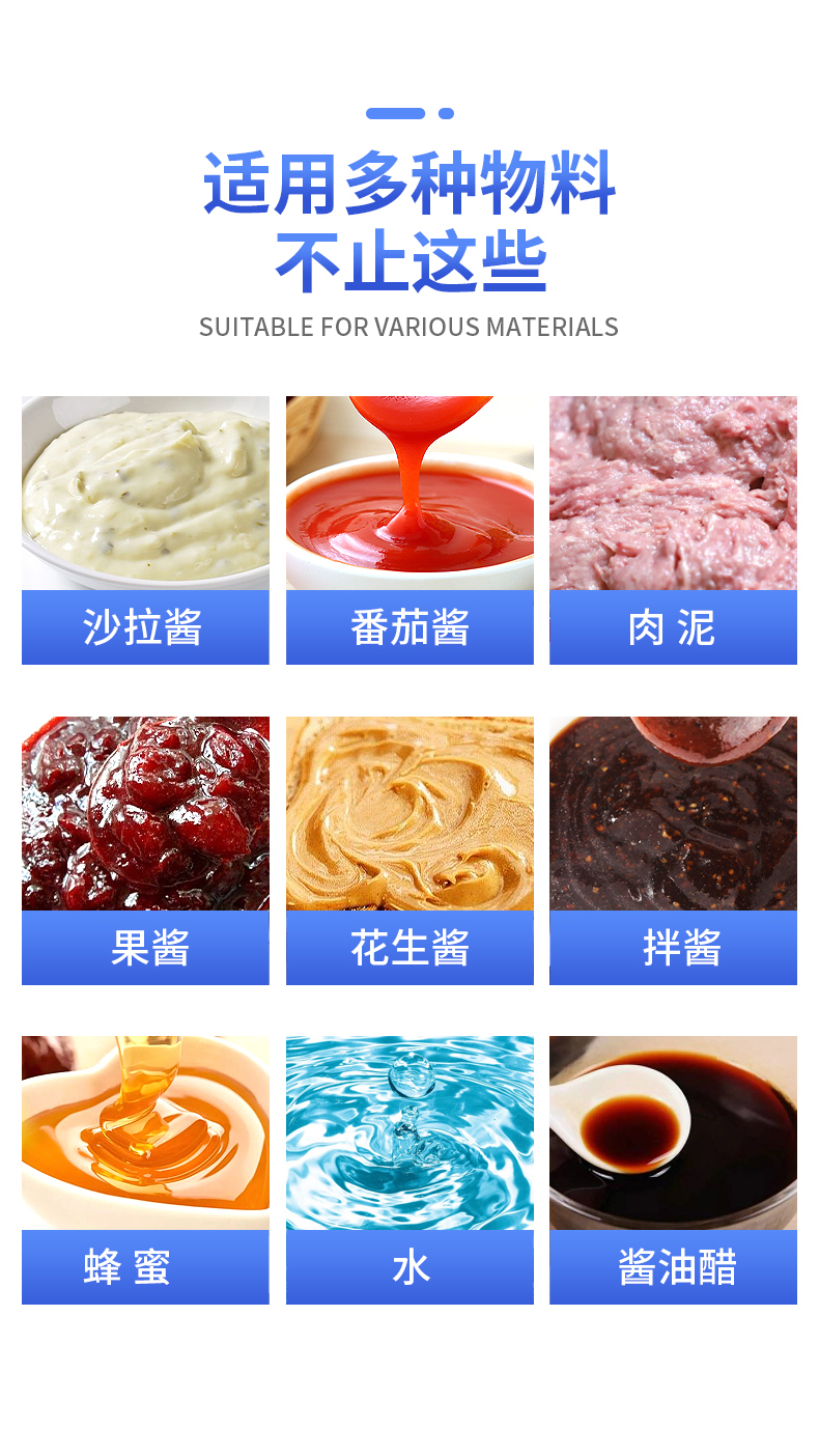 番茄酱、蜂蜜、沙拉酱、花生酱、洗衣液、沐浴液、酱油醋、等各种带流动性的液体膏体