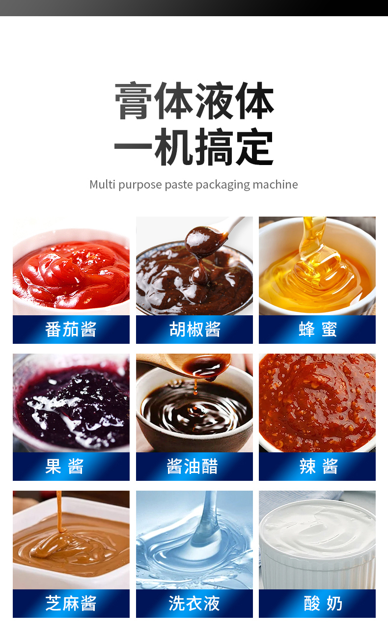 番茄酱、蜂蜜、沙拉酱、花生酱、洗衣液、沐浴液、酱油醋、等各种带流动性的液体膏体