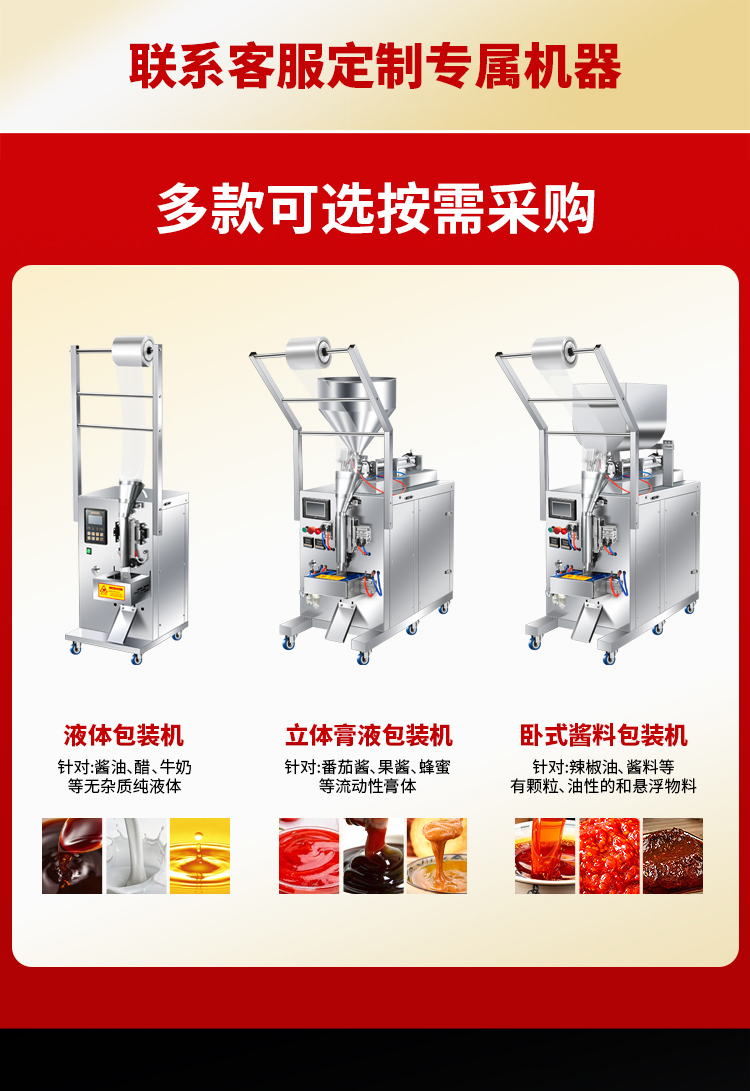 辣椒油、豆瓣酱、番茄酱、火锅底料、沙拉酱、胡椒酱、果酱、凉皮料水等各类带油性悬浮物料