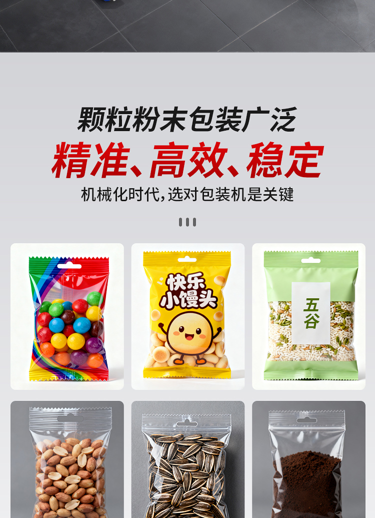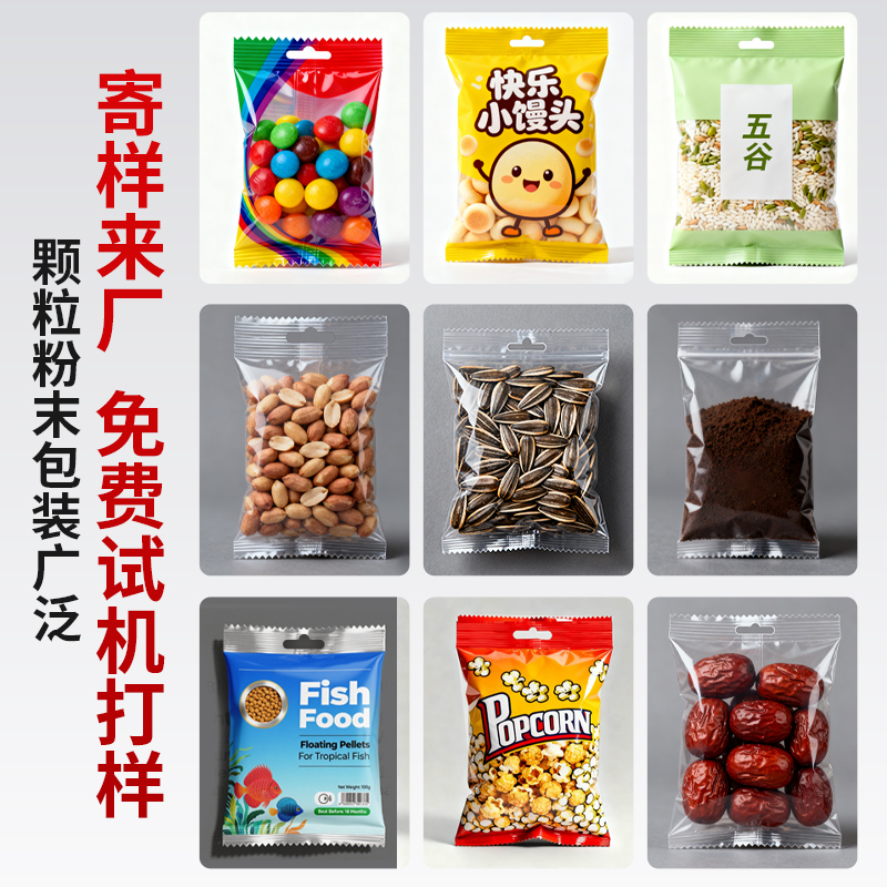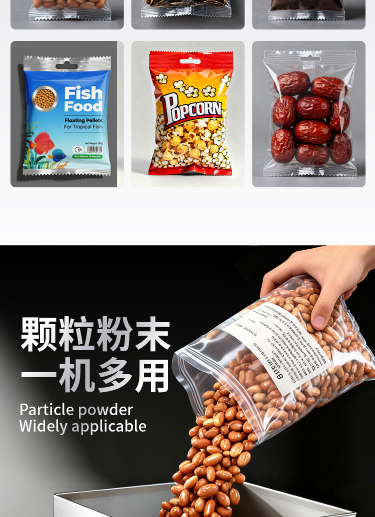 - 五谷、种子、粉末、坚果、红枣、薯片、膨化零食、冲剂、饲料、化肥、瓜子、珠子等各类小颗粒和粉末产品